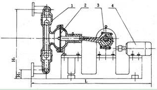 电机“4”通过减速箱“3”带动左右柱塞上面的隔膜“2”一前一后往复运动,在左右两个泵腔内,装有上下单向球阀“1”,隔膜的运动,造成工作腔内的容积的改变,迫使四个单向球阀交替开启和关闭,从而将液体不断的吸入和排除。